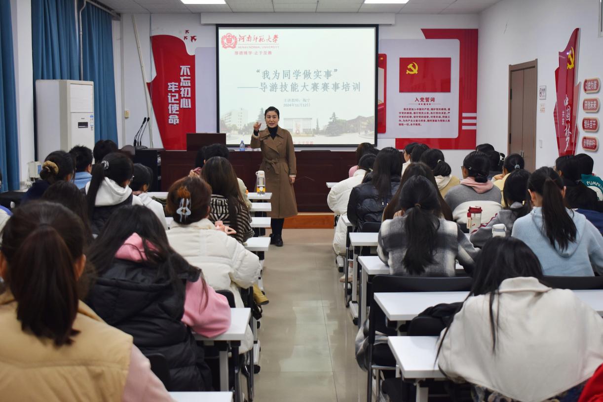 为增强学生专业技能,提升专业素养,11月12日下午,旅游学院在琢玉楼多功能报告厅开展第三届导游技能大赛赛事培训。培训由学院“我为同学做实事”团队策划,旅游学院副教授陶宁主讲,学院60名参赛选手参加培训。