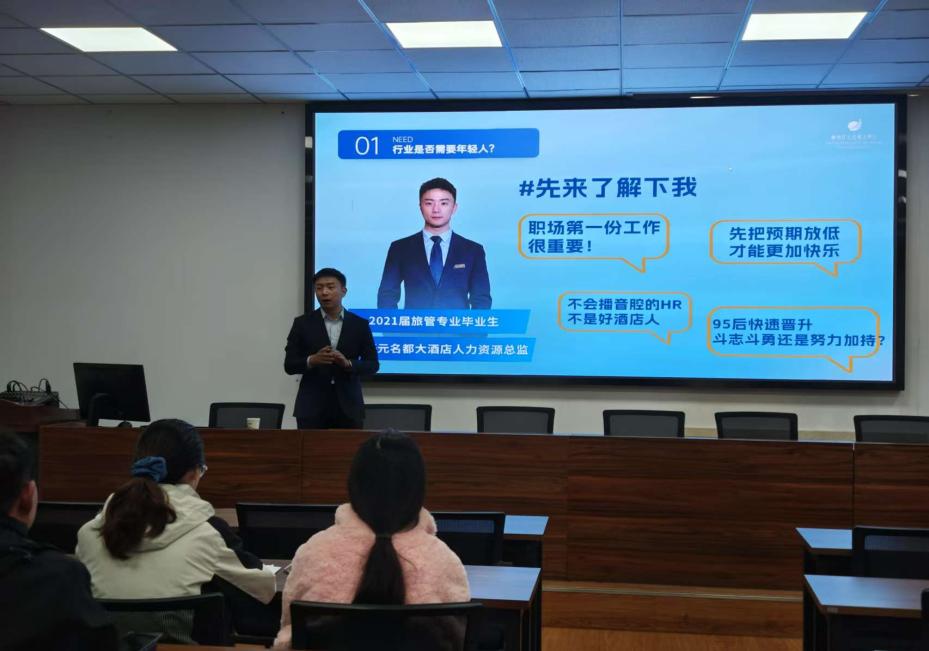 为增强我院旅游管理专业学生对旅游行业、酒店行业的认知与理解,进一步拓宽学生视野,明确学习目标,科学规划大学生涯,1127日上午,我院在三楼行知讲堂举办了旅游管理专业认知教育主题讲座。此次讲座邀请了嵊州开元名都大酒店人力资源总监李昊轩担任主讲人,旅游学院副院长付强、实习实训主任耿妍以及2022级旅游管理专业的全体学生共同参加。