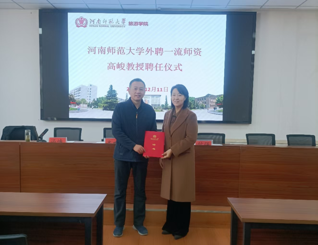 杨玉珍对上海师范大学高峻教授莅临我校为本科生授课表示热烈欢迎,对高教授长期以来为旅游学院学科建设、一流本科专业建设等工作的大力支持表示衷心的感谢。同时提出希望旅游学院以国家一流专业建设为契机,以一流师资带动专业内涵建设,打造学科专业特色优势,提升人才自主培养质量,为国家培养更多合型高级人才。并为高峻教授颁发学校兼职教授聘任证书。