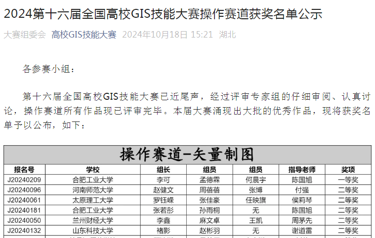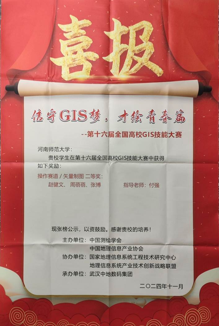 近日,由中国测绘学会、中国地理信息产业协会共同主办的第十六届全国高校GIS技能大赛操作赛道获奖名单公布。我院参赛团队(赵健文、周蓓蓓、张博)参加了矢量制图赛道,该赛道共设立一等奖1个,二等奖5个,三等奖15个和优秀奖30个。团队成员凭借出色表现荣获矢量制图赛道二等奖(赛道第二名),并获得MapGIS制图工程师资格证书,付强老师荣获杰出指导教师奖。