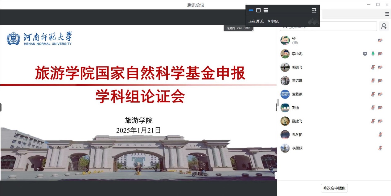 1月21日上午,为进一步提升学院教师国家自然科学基金申报质量,旅游学院召开了国家自然科学基金申报学科组论证会。此次论证会邀请到了辽宁师范大学狄乾斌教授、张威教授以及伟德官网下载苹果版旅游学院安传艳副教授作为论证专家进行一对一指导,会议由安传艳老师主持,旅游学院近20位老师通过线上线下相结合的方式参会。