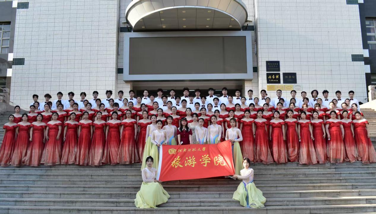 旅游学院学子们在选拔阶段就积极踊跃报名参加,随后更是以积极昂扬的态度参与到训练之中,教练与同学们的默契配合为旅游学院的精彩表现打下坚实基础。旅游学院作为第一篇章“青春因理想而闪耀”的第六支队伍,以一首《天耀中华》表达了对祖国深沉的爱。钢琴师徐铨垚的从容演奏配合着乐器伴奏者苏朔的演绎,两者交相呼应,优美旋律动人心弦,指挥郝佳奕动作端庄优雅,同学们配合着手势进行演唱。那自信昂扬的姿态展现出旅院学子的青春面貌,那富有感情的歌声表达了旅院学子对祖国的深切祝福。同学们深情的演唱打动了在场的每一位观众,让观众深刻感受到旅院学子们激情澎湃的青春力量。