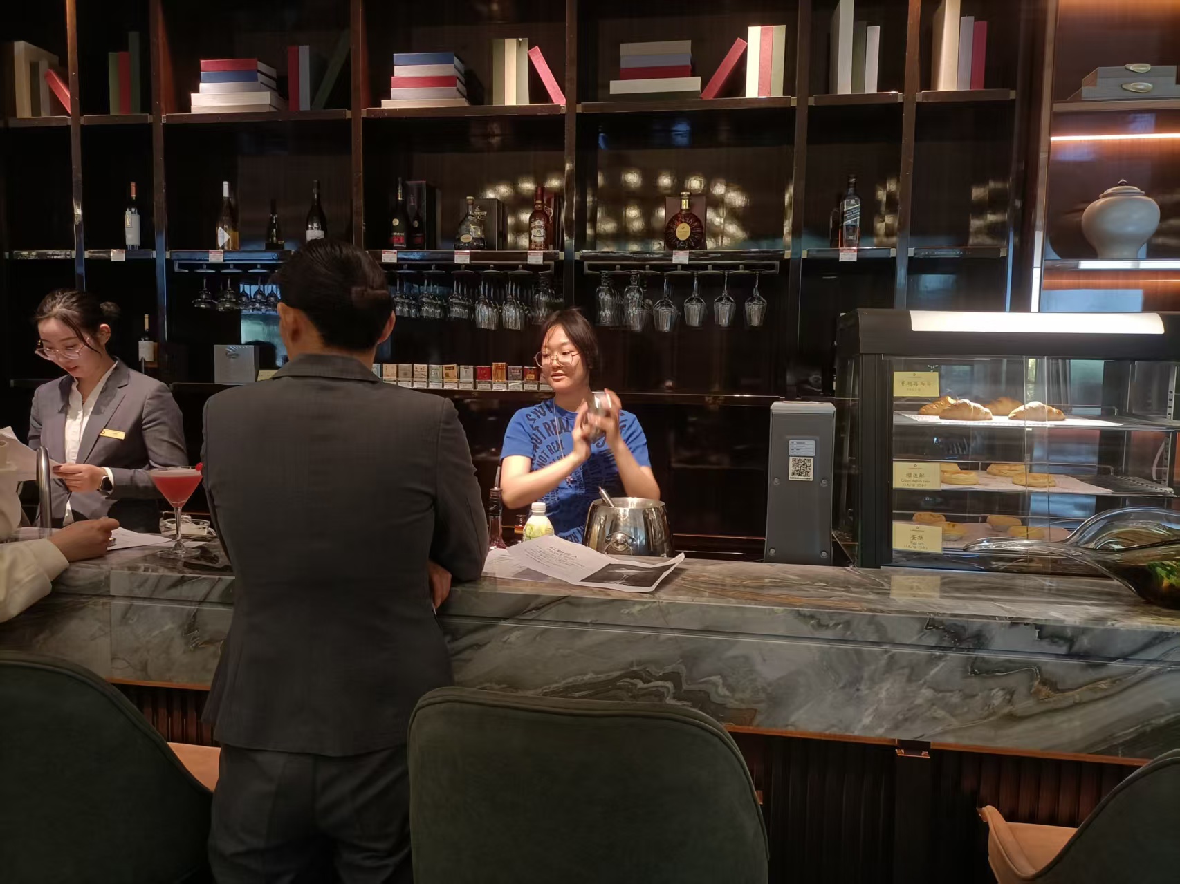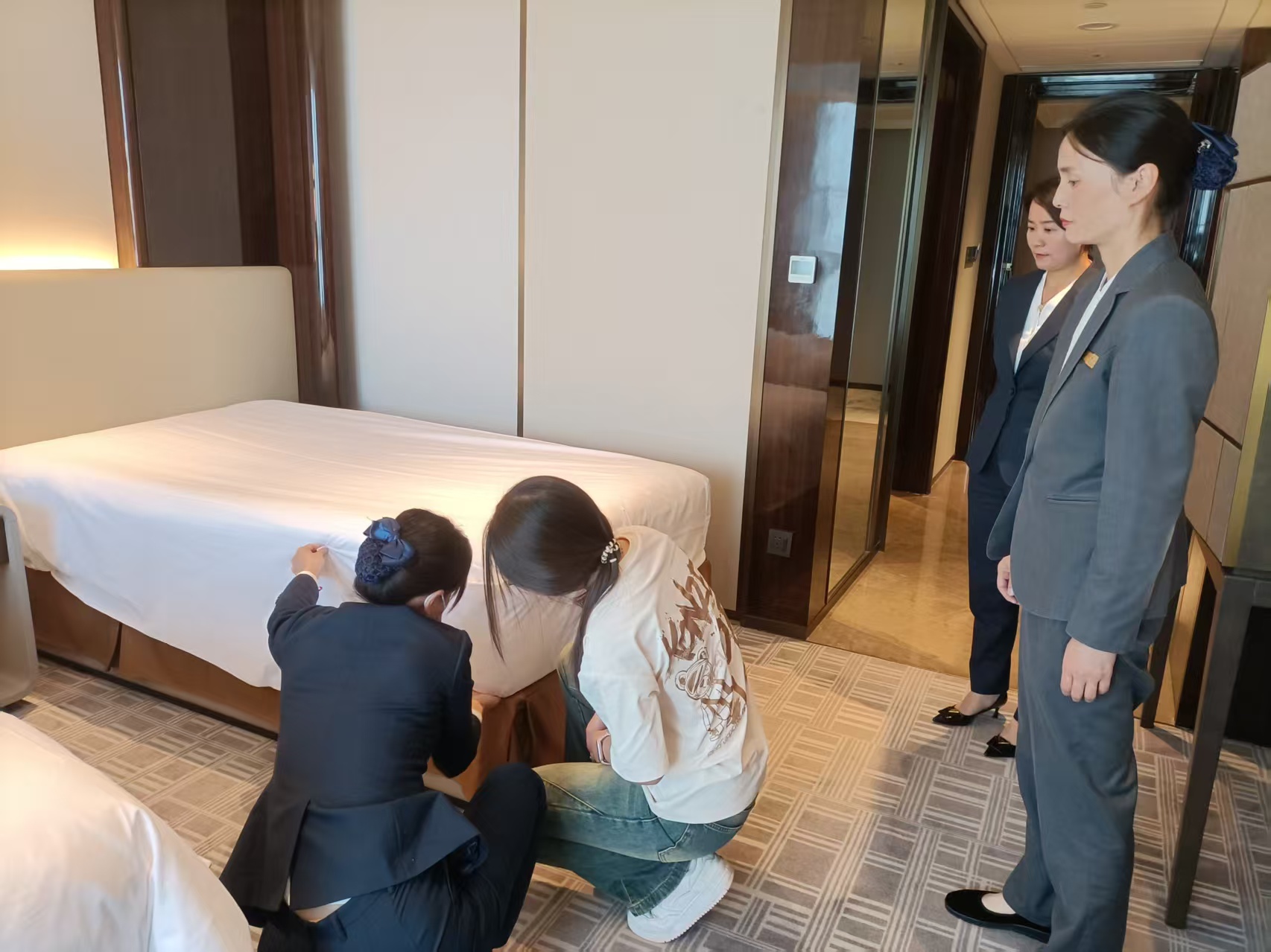 在雷迪森酒店的实地参观中,学生分组深入前厅部、客房部、餐饮部等核心部门,观摩标准化服务流程。本次实训设置了“酒店服务技能大赛培训”,涵盖中餐摆台、西餐摆台、客房铺床、鸡尾酒调酒等赛项,以赛促学,强化学生实操能力。此外,各部门经理还进行了“职业礼仪培训”,强调服务意识与沟通技巧的重要性,帮助学生树立“宾客至上”的服务理念。