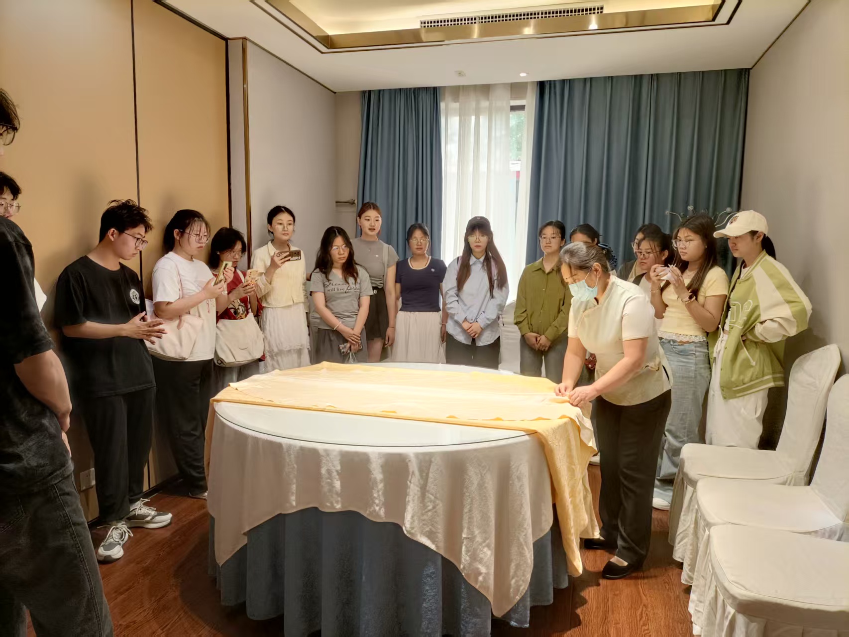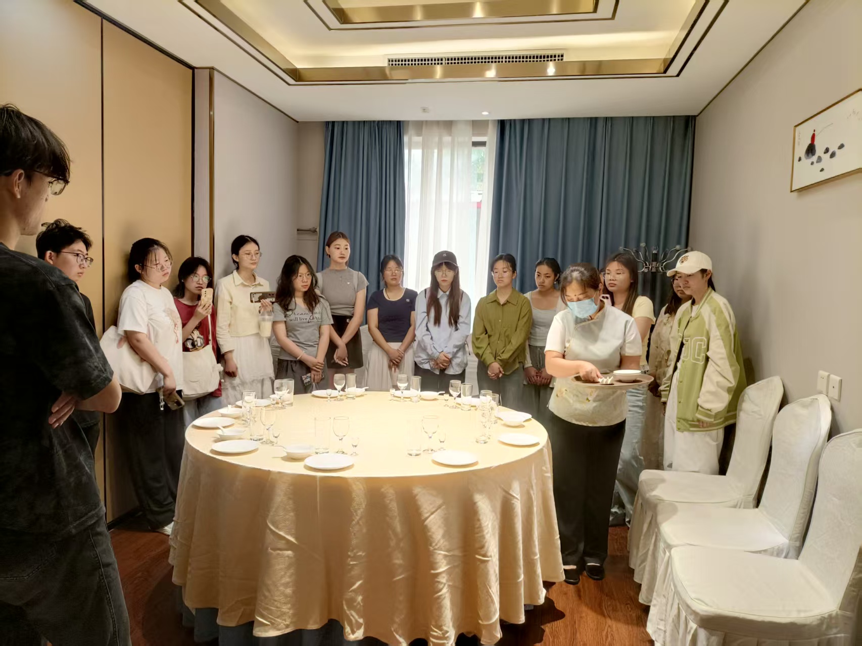 本次活动通过企业参观、资深员工讲解、技能实操等形式,帮助学生构建行业认知框架,增强职业素养,为未来职业发展奠定坚实基础。在实地参观中,学生们分别深入客房部和餐饮部,由餐饮部与客房部资深员工对中餐摆台、中式铺床等标准化服务流程进行演示。每位学生照着标准操作流程进行了实操训练。