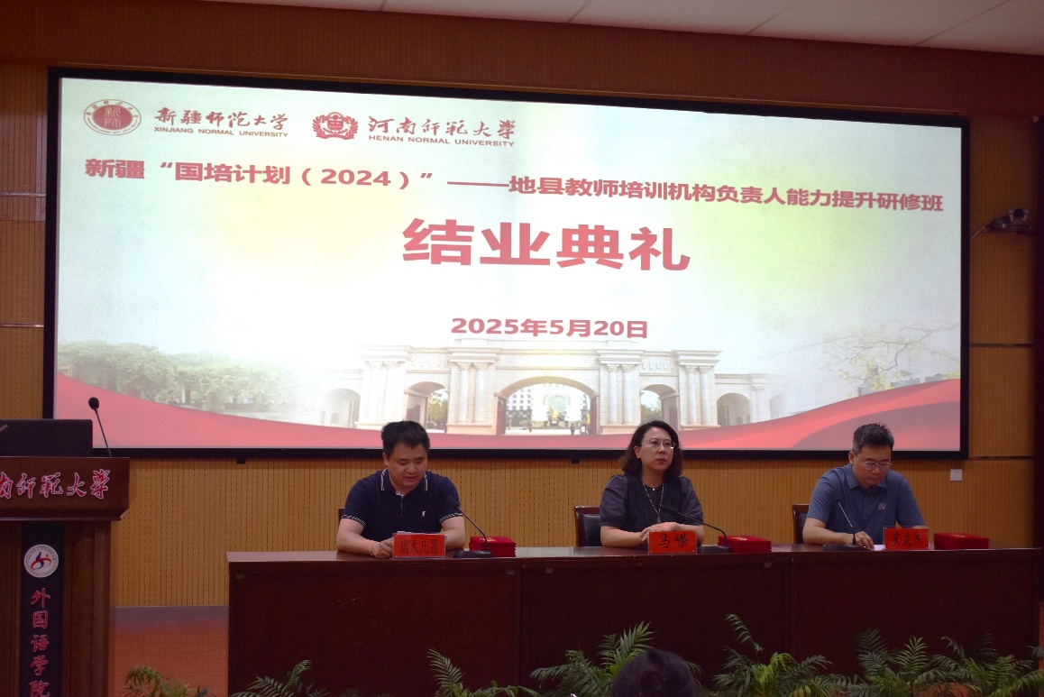 5月20日,新疆“国培计划(2024)”—地县教育行政部门书记(局长)研修班与新疆“国培计划(2024)”—地县教师培训机构负责人能力提升研修班圆满完成,并隆重举行了结业典礼仪式。继续教育学院副院长翟炎杰、新疆师范大学国培专家马嵘教授、旅游学院副院长端木凡昌及全体学员参加了结业典礼仪式。结业典礼仪式由旅游学院副院长端木凡昌主持,翟炎杰致辞,马嵘做总结发言,参培学员代表李荣发表了培训结业感言,典礼上为本次培训优秀学员们颁发了获奖证书。
