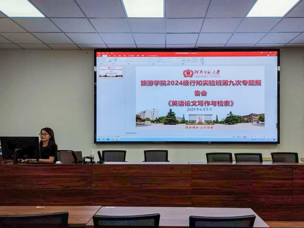 6月5日中午13:00,旅游学院2024级行知实验班于学院3楼行知大讲堂举行第九次专题报告会《英语论文写作与检索》。本次报告会由陶舒婷老师担任主讲人,班主任孟帅康主持。
