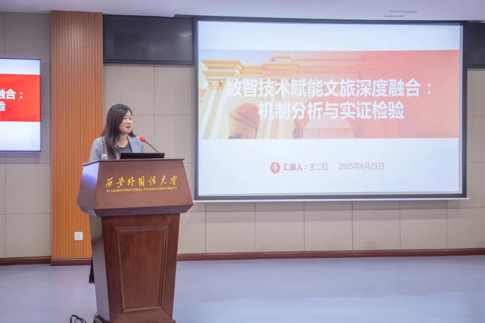 为深入贯彻习近平总书记关于黄河流域生态保护和高质量发展的重要指示精神,充分挖掘黄河流域丰富的文化旅游资源潜力,推动文旅产业与生态保护、乡村振兴、区域协同发展深度融合,激发区域发展新动能,西安外国语大学旅游学院于2025年6月20-22日在陕西省西安市召开“黄河流域文旅融合高质量发展研讨会”。我院王二红老师受邀并做题为《数智技术赋能文旅深度融合:机制框架与实证检验》的主旨报告。