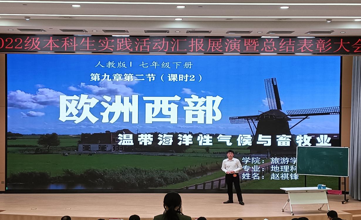 本次大赛以“精育良才 教育报国”为主题,从15个师范学院(部)21个师范专业中遴选出15名师范生参加课堂教学技能比赛,评选出特等奖3名、一等奖5名、二等奖7名。比赛以现场模拟授课为主要考察环节,重点考察选手的教学基本功、课堂组织能力和学科核心素养的落实。赵祺锋同学以《欧洲西部–温带海洋性气候与畜牧业》为授课内容,巧妙运用情境教学法,结合多媒体技术和互动式教学手段,将抽象知识生动化,充分体现“以学生为中心”的教学理念,赢得了评委的高度认可。“他的课堂不仅逻辑清晰,更充满感染力,能够有效激发学生的学习兴趣。”来自漯河实验高级中学的校长在点评中特别肯定了赵祺锋同学的教学表现。