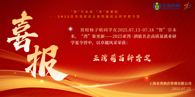 为深化职业教育实践,提升学生职业素养,我院旅游管理专业4名学生于713日至718日参加了由上海亚湾酒店管理公司主办的“智”引未来 “湾”象更新—2025亚湾酒旅名企高质量就业研学夏令营。4同学凭借扎实的专业知识、出色的实践能力和高度的团队精神,在研学活动中表现突出,获得主办方的高度评价,展现了我校学子的卓越风采。