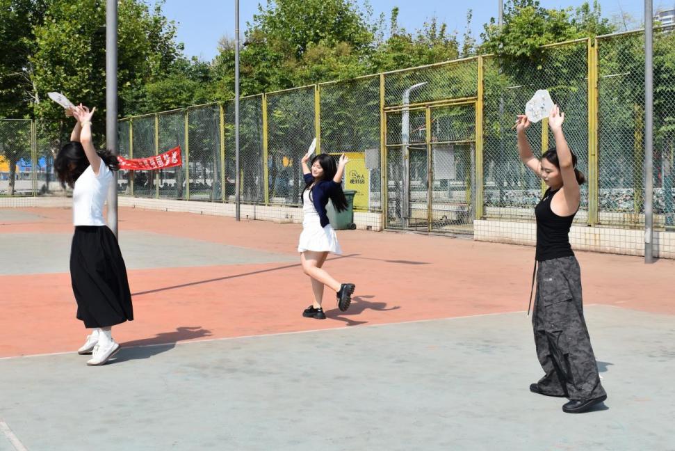 来自MJ街舞社团的表演者们乘势而上。社团成员李梓彤、窦稀玥为大家带来双人舞蹈串烧。她们踏着鼓点,裙摆与衣角划出耀眼弧线,新生们的欢呼声愈加响亮。两位表演者自信收场,全场掌声雷动,将活动氛围推向高潮。社团成员赵雨宸、李梓彤与窦稀玥合力带来古典舞《洛春赋》,悠扬的音乐配合着柔美舒展的动作,将古典诗词中的意境展现的淋漓尽致,余韵伴随着掌声久久萦绕在军训场上。