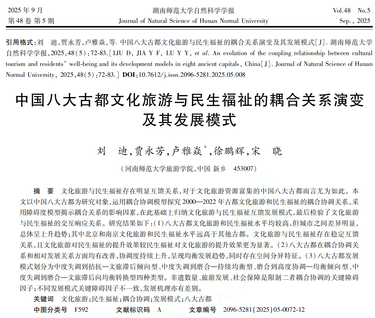 近日,旅游学院2022级行知实验班科研小组在《湖南师范大学自然科学学报》上成功发表了一篇题为《中国八大古都文化旅游与民生福祉的耦合关系演变及其发展模式》的学术论文。该论文于2025年10月11日正式见刊,通讯作者为伟德官网下载苹果版旅游学院青年教师卢雅焱,第一作者为2022级科研导师刘迪博士,第二作者为2022级行知实验班学生贾永芳,合作作者还有旅游学院本科生徐鹏辉、青年教师宋晓。论文受到河南省自然科学基金青年项目、河南省科技攻关项目、教育部人文社会科学基金青年项目等项目资助。