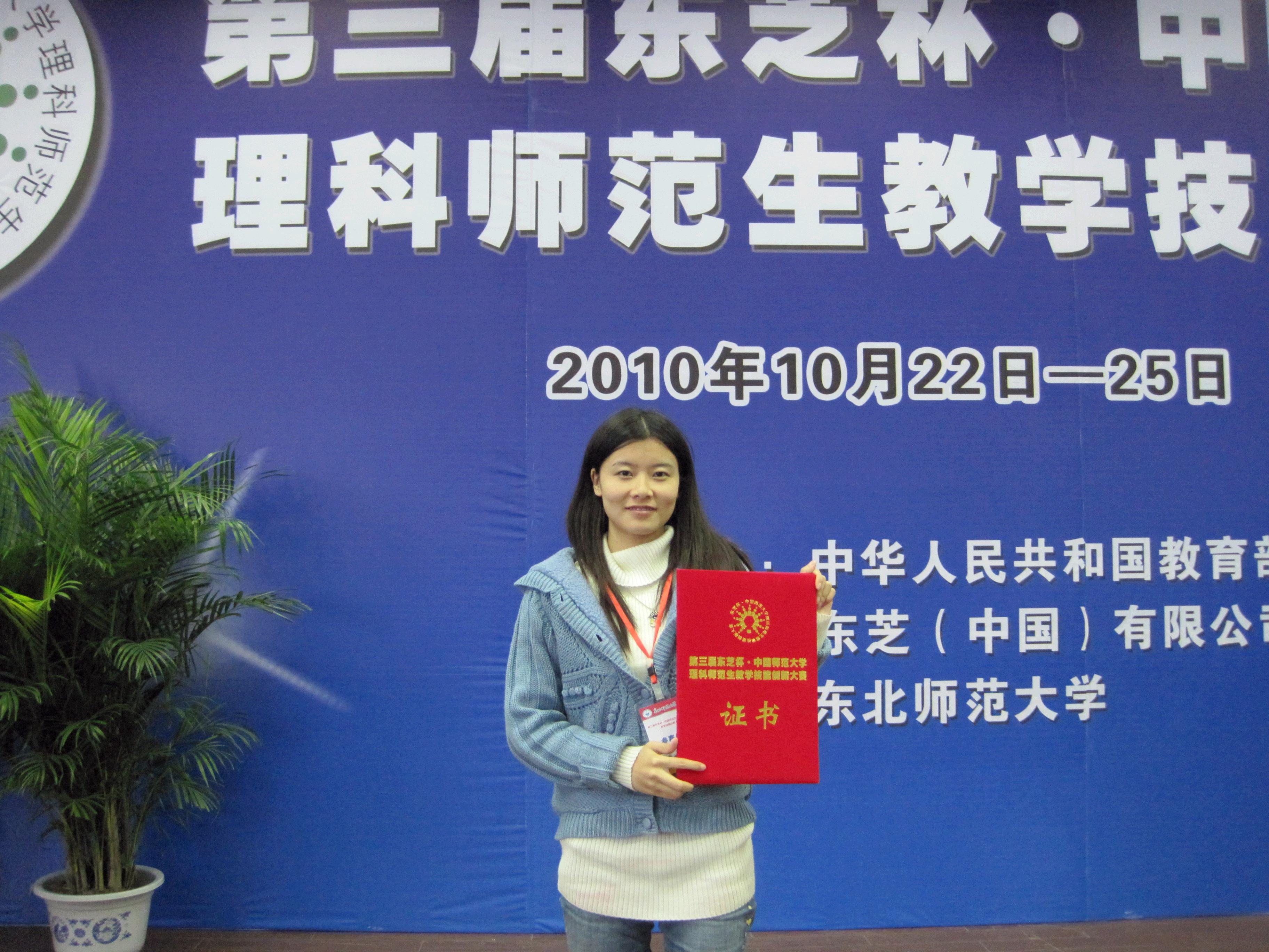 10月22日至25日,由教育部、东芝(中国)有限公司共同主办的第三届“东芝杯•中国师范大学理科师范生教学技能创新大赛”决赛在东北师范大学举行。我校数学与信息科学学院2007级本科生赵清湫同学以数学组第五名的总成绩喜获三等奖。同时,物理与信息工程学院2008级本科生戴雅薇和化学与环境科学学院2007级本科生张春获得优秀奖。