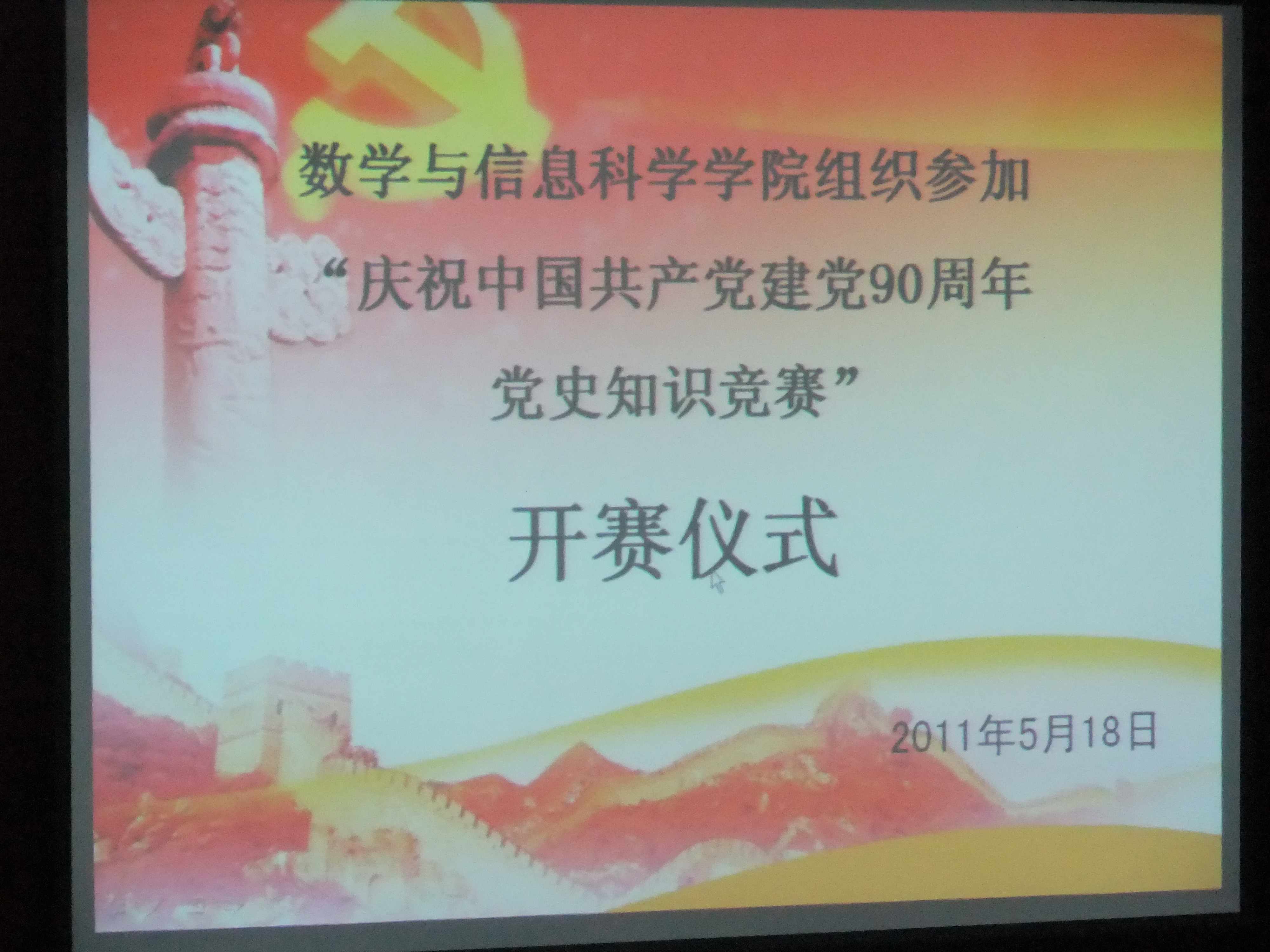 为庆祝中国共产党成立90周年,帮助广大学生党员学习和了解党的历史知识,5月19日晚,数学学院在院报告厅举行“参加全国庆祝中国共产党成立90周年党史知识竞赛”活动开赛答题仪式。校党委组织部、数学学院负责人和学生党员、入党积极分子200余人参加了仪式并现场答题。