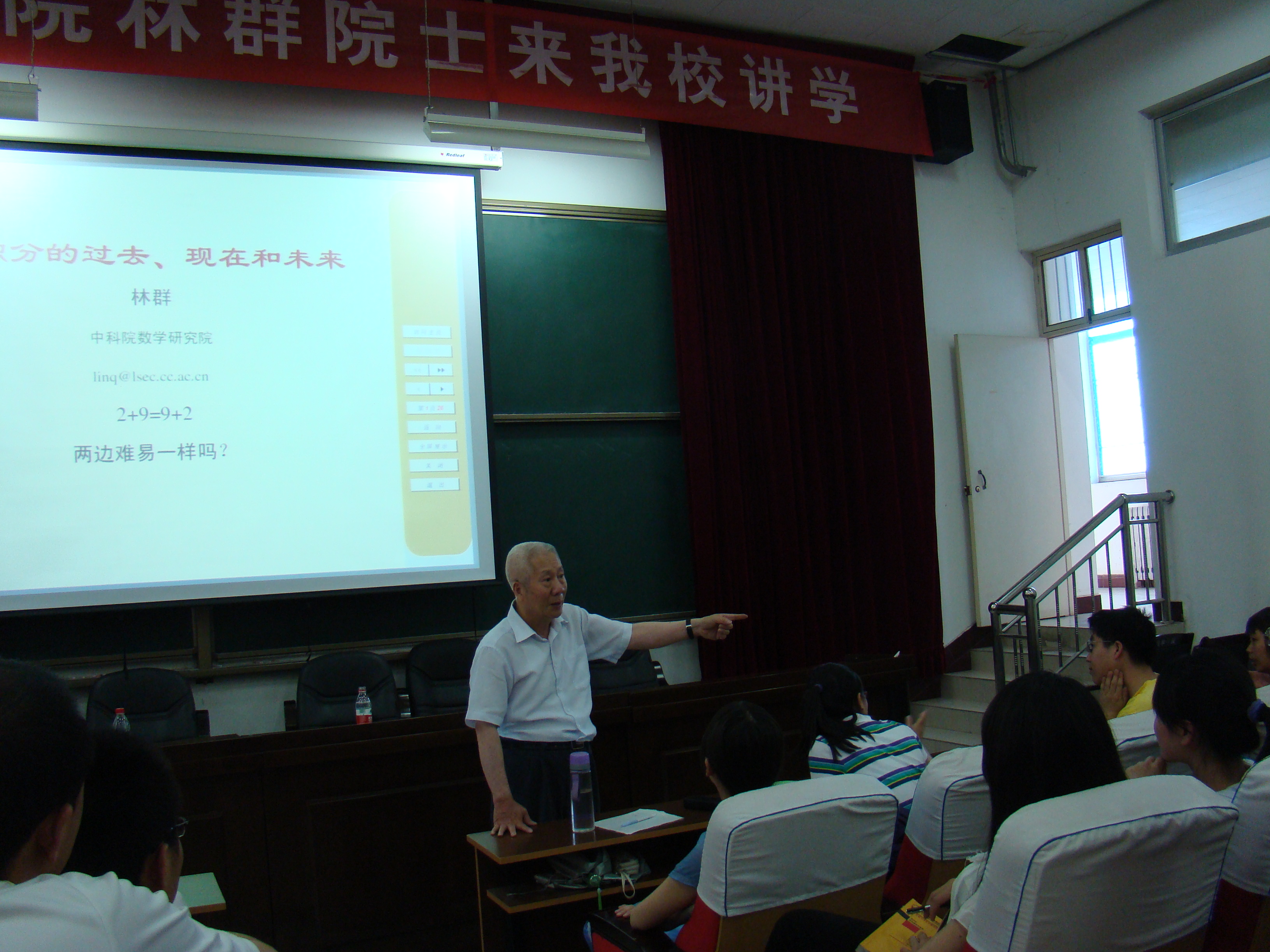 林院士从微积分的基本内容入手,提出直接用微积分基本定理,避开极限概念来讲述计算数学的加速收敛与逼近理论。随后,林院士用通俗的语言讲述了什么是微积分,解释了割线、切线、斜率差以及基本定理最短证明。报告中,林院士还认为学习数学要有创新意识,要会大胆猜想。同时鼓励大学生们要有追求的学习,成为即能掌握理论知识,又会实际应用的学生。 报告会的最后,林院士和在座的师生一起互动交流。针对同学们所提出的“数学发展的新方向”、“泛函分析在计算机中的应用”等问题,林院士用诙谐的语言和独到的见解更是给在座的同学奉献了一顿“学术美餐”。他并且把自己的著作《微积分快餐》赠予部分提问的同学。 (数学学院 苗山根)