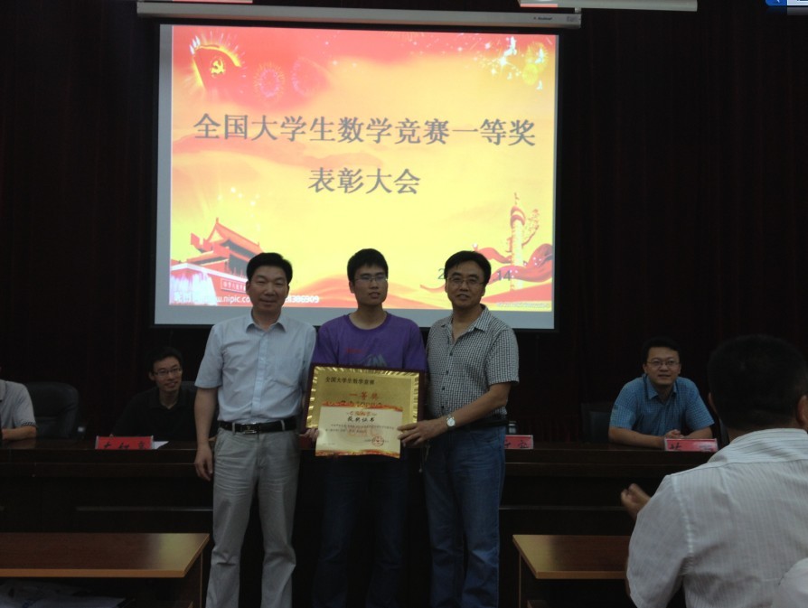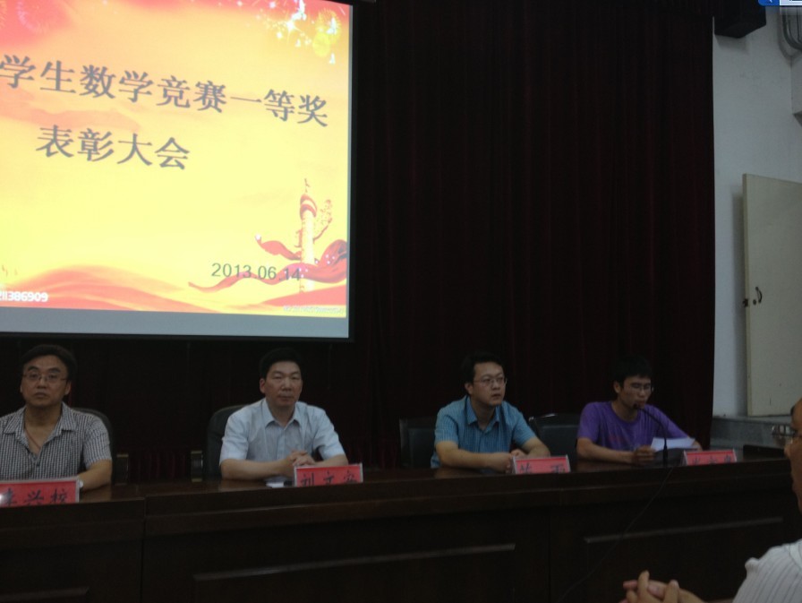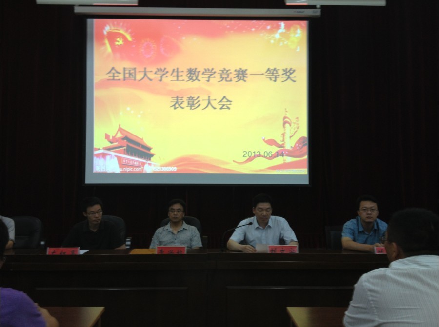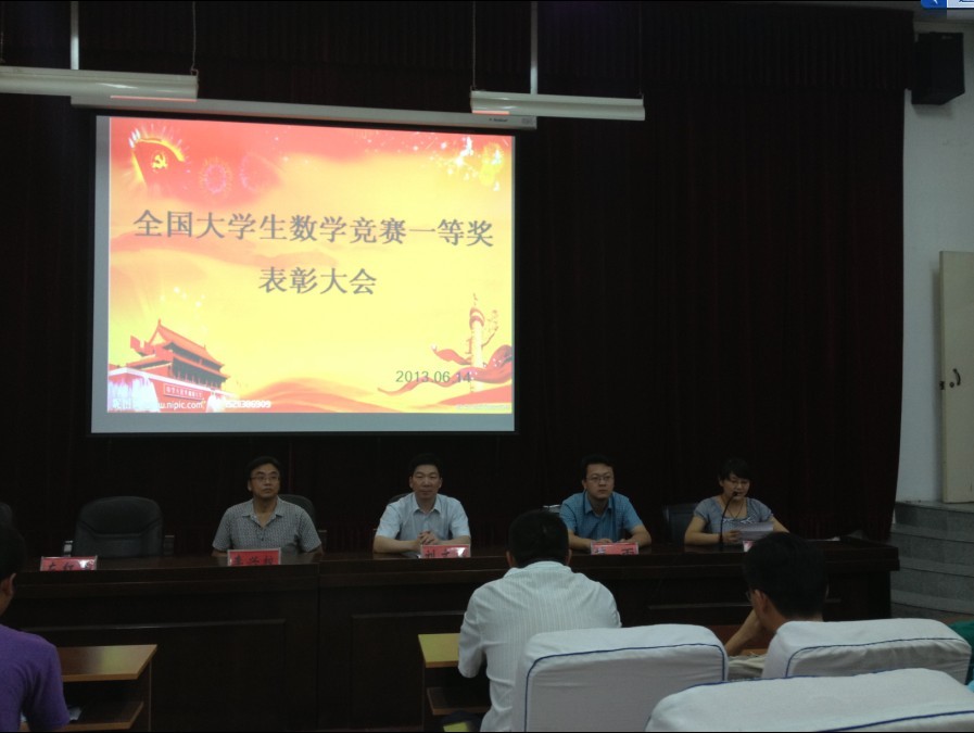 李富杰副书记首先介绍了数学学院09级王瑞鑫同学在2013年3月由中国数学会主办的第四届大学生数学竞赛决赛中奋勇拼搏,以全国第八名的成绩荣获一等奖。该奖项是河南赛区唯一的一等奖,全国仅有19人获此殊荣,实现了我校在全国数学竞赛中一等奖零的突破 。