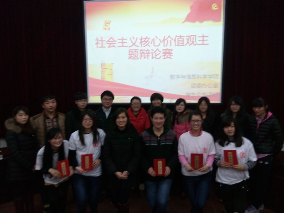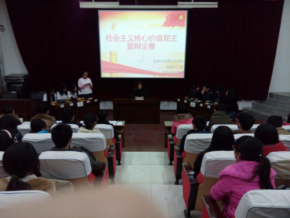 群雄舌战展雄风,针锋相对辩天下。为深入贯彻落实社会主义核心价值观,1月25日晚,数学与信息科学学院在学院多功能报告厅举办“社会主义核心价值观”之“雄辩中国”主题辩论赛。2012级辅导员杜亚璇,2014级辅导员吴小林与2013级、2014级二百余名同学一同参与了此次活动。