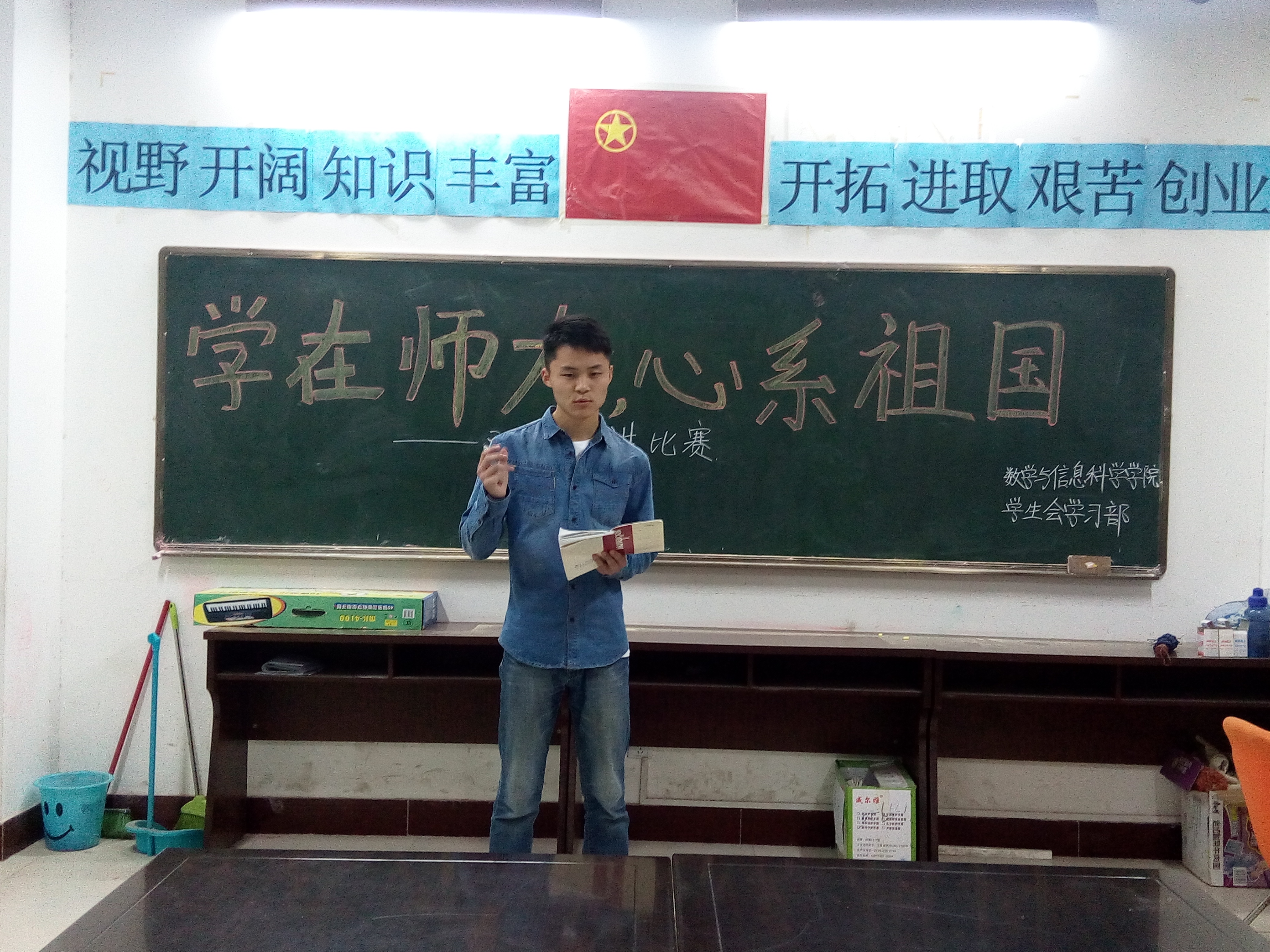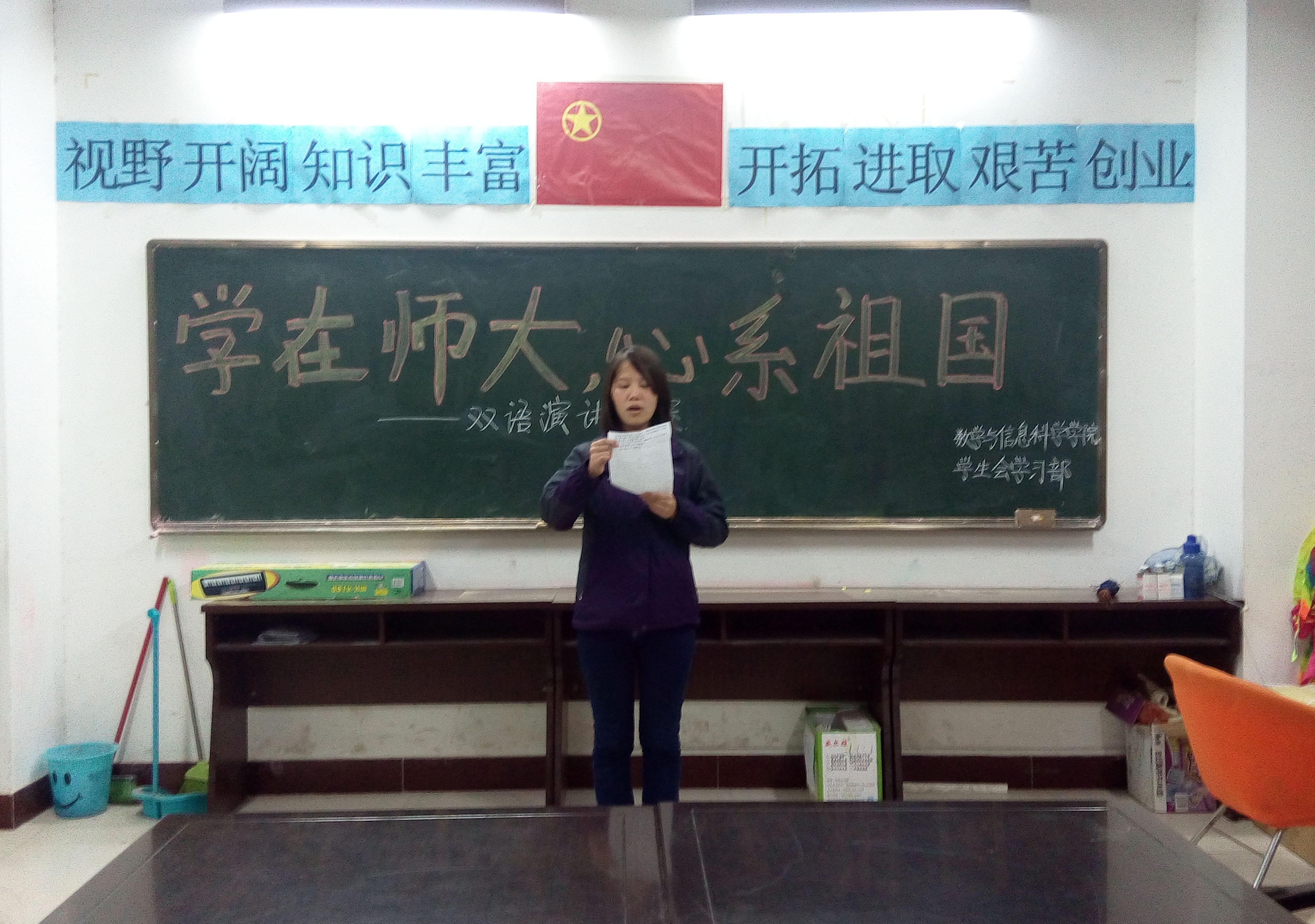 为弘扬“尚诚朴、勤学问、重团结、养正气”的优良学风,激发学生爱校荣校的青春热情和追梦师大的壮志豪情,4月19日,数学与信息科学学院于数学楼学生会办公室举办以“学在师大,心系祖国”为主题的双语演讲比赛。2013级、2014级学生积极参与其中。
