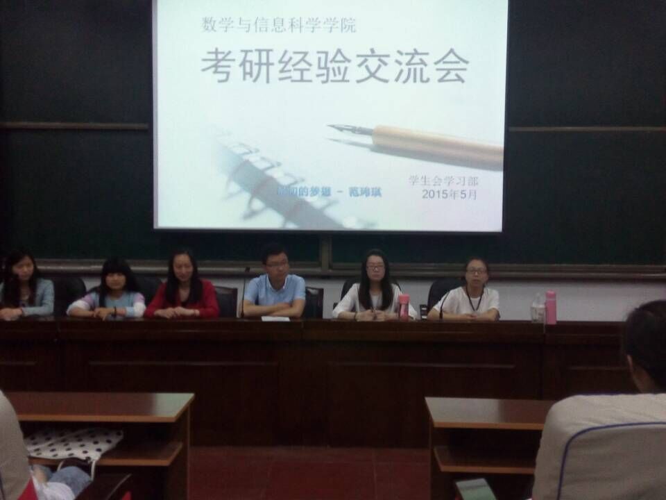 为帮助同学们解决对考研的困惑,掌握相关考研技巧,了解更多考研信息,5月8日晚,数学与信息科学学院于院多功能报告厅举办考研经验交流会。2011级六位研究生代表出席此次交流会,2012、2013、2014级共近二百名学生参与此次活动。