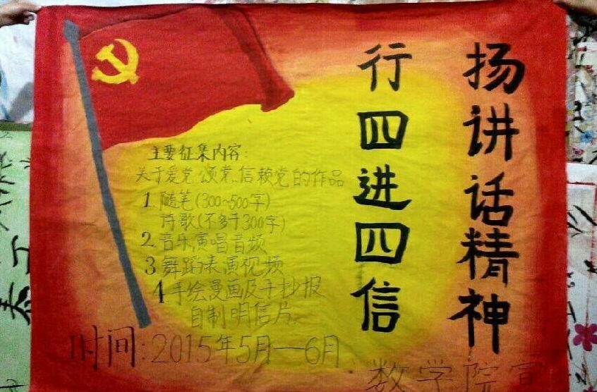 扬讲话精神,行四进四信。5月4日至6月1日数学与信息科学学院团委办公室举办“扬讲话精神,行四进四信”作品征集活动。活动吸引2013级、2014级百余名同学参与其中。