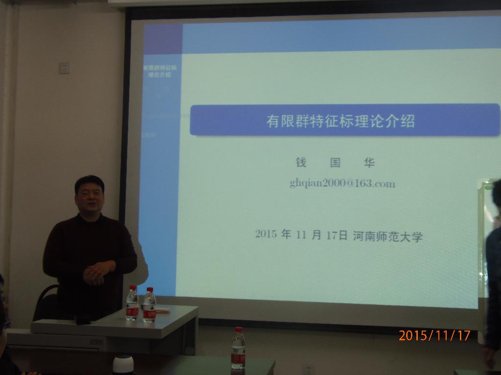 11月17日晚,常熟理工学院数学与统计学院钱国华教授在数学楼107教室作了题为“有限群特征标理论介绍”的学术报告。报告由数学学院副院长左红亮主持,学院部分青年教师及研究生参加了此次报告。