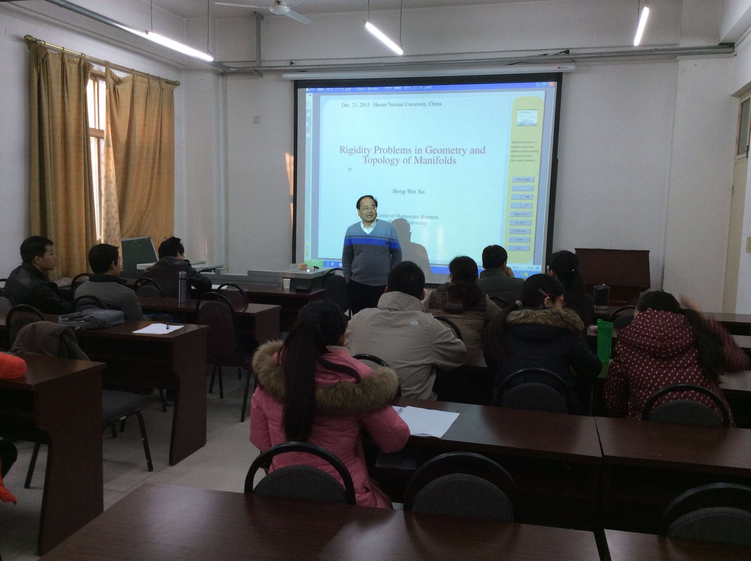 12月21日,应数学与信息科学学院邀请,浙江大学博士生导师许洪伟教授在数学楼107教室作了一场主题为“Rigidity Problems in Geometry and Topology of Manifolds (流形几何与拓扑中的刚性定理)” 的学术报告,我院青年教师、研究生三十余人聆听了报告。此次报告由院长李兴校主持。
