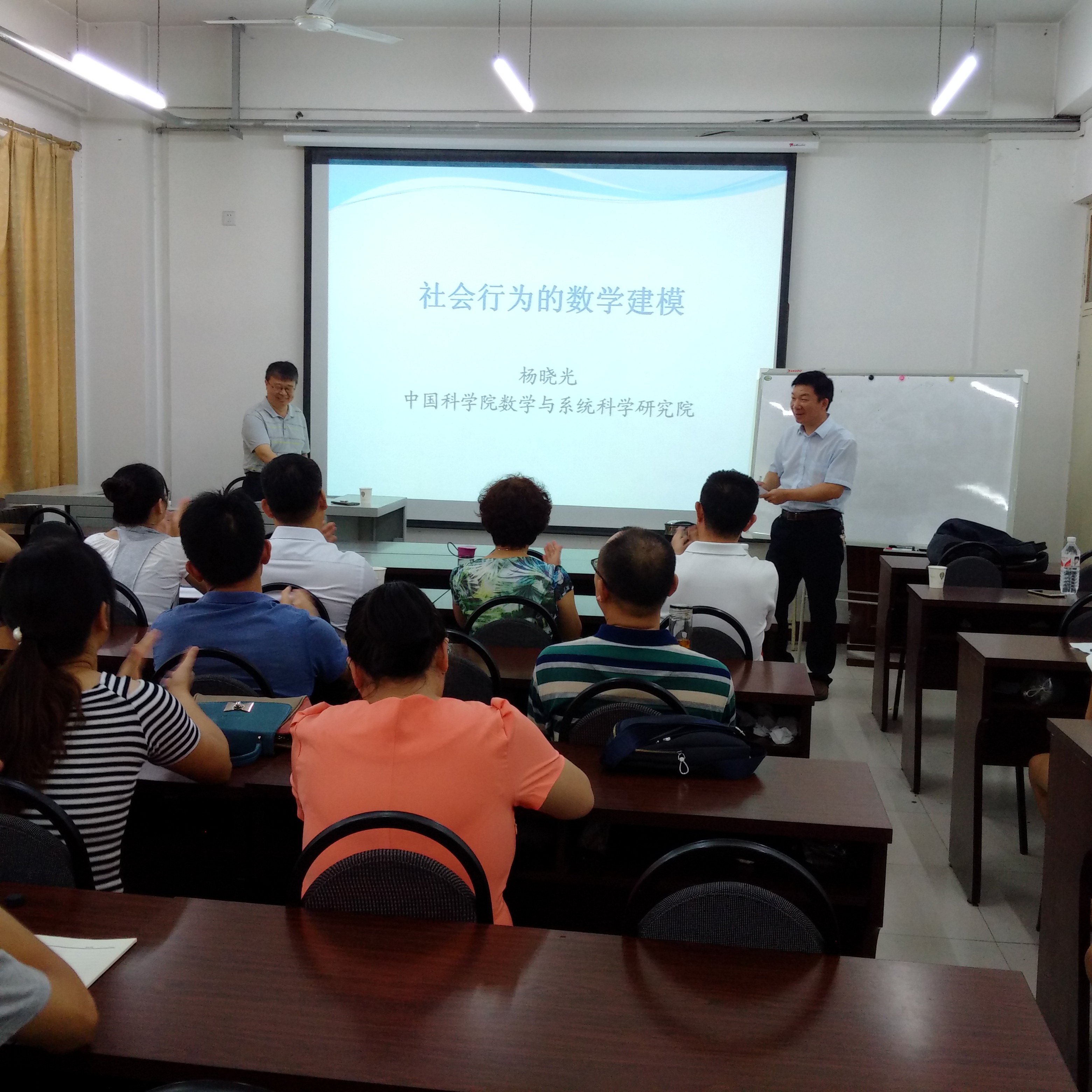 8月14日上午,应数学与信息科学学院邀请,中国科学院数学与系统科学研究院博导、中国青年科技奖、国家杰出青年科学基金、北京市科学技术进步一等奖、教育部科技进步一等奖、茅以升青年科技奖的获得者、国务院特殊贡献专家杨晓光研究员在我院多媒体教室作了题为“社会行为的数学建模”的学术报告,我院部分青年教师和研究生代表参加了此次报告会。报告会由学院院党委书记刘文安教授主持。