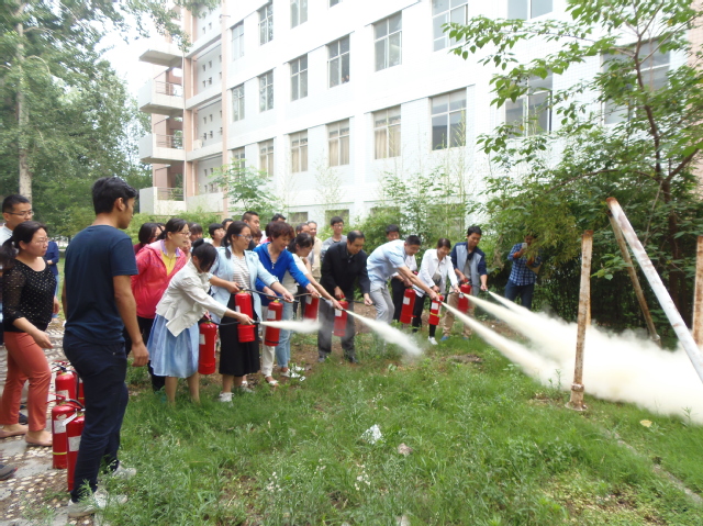 王胜军科长为大家讲解了基本消防安全制度,并简要介绍相关法律法规,旨在使大家形成基本消防观念。而后,王胜军科长针对数学楼建筑结构向在座师生讲解了火灾发生时所应具备的灭火与逃生技能,楼道火灾逃生最重要的是防浓烟,而湿毛巾防烟法是较为主要的自救方法。王罡老师向老师们介绍了灭火器结构及使用方法。接着,王罡老师在数学楼内的空地对老师们进行了消防水枪操作指导,三组老师现场操作了消防水枪。随后王胜军科长、王罡老师与老师们一起在数学楼外的空地进行了灭火器的操作演练,四十余位老师进行了实际操作。