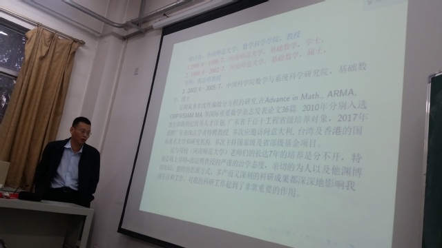 10月27日下午,应我院邀请,我院系友、华南师范大学博士生导师喻洪俊在我院数学南楼107会议室作学术报告。我院相关专业教师、研究生、本科生共三十余人聆听了报告。