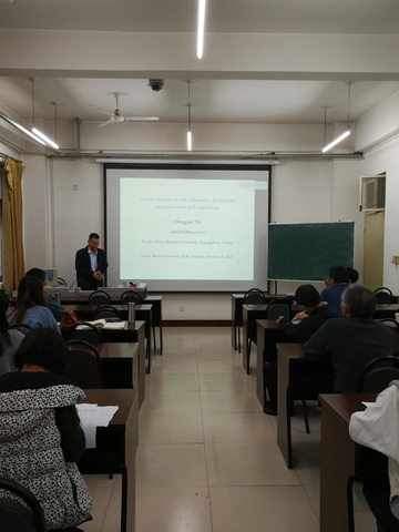 喻洪俊介绍了相对的Boltzmann方程的一些最新进展工作,包括整体解的存在性、大时间行为、空间正则性的传播。在座的师生们与喻洪俊教授就相关问题进行了积极的提问与交流,大家对这一研究方向有了更深入的了解,同时也开阔了广大师生的视野。