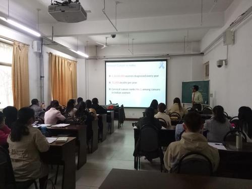 Roy教授作了题为“Mathematical Control of HPV Associated Cervical Cancerous Cell and Its Possible Extinction”的学术报告。本次报告中,Roy教授首先介绍HPV的生成原理,以及诱发宫颈癌的机率,指出宫颈癌为造成印度女性死亡人数最高的癌症。然后,阐述如何利用数学模型刻画细胞免疫与病毒细胞扩散的化学反应过程,建立了以S(susceptible cell)、I(HPV infected cell)、C(Cancerous cell)、T(CTL/CD8+ cell)、V(HPV particle)为因子的数学随机模型,并给出预防与治疗宫颈癌的具体措施。会后,Roy教授详细地解答了与会师生提出的问题,现场气氛火热。