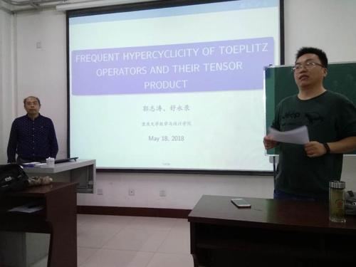 5月19日上午,应数学与信息科学学院邀请,重庆大学博士生导师舒永录教授在数学楼107报告厅作了题为“Frequent hypercyclicity of Toeplitz operators and their tensors product”的学术讲座。学院相关负责人、青年教师、研究生聆听了报告。