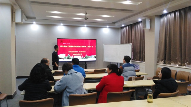 11月27日上午,按照学校党委“关于认真学习贯彻《中国共产党支部工作条例(试行)》的通知”要求,数学与信息科学学院教工三支部在数学南楼103召开会议,集中学习《中国共产党支部工作条例(试行)》。由支部书记裴永刚领学,院党委书记刘文安作了进一步讲解和阐释,并要求全体党员理论学习时要真正领会精神、弄懂内容、把握要求,工作实践中要认真贯彻落实,密切联系群众,全面提升党支部的组织力,充分发挥党员的先锋模范作用和党支部的战斗堡垒作用。