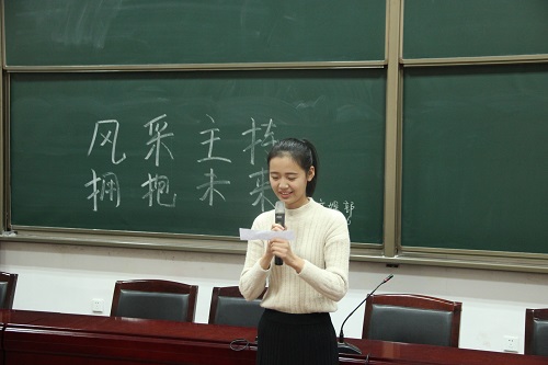 比赛秉承展现文化内涵、智慧才华与整体气质并重的原则,经过初赛、复赛的层层选拔,共有五位选手脱颖而出,跻身决赛。在决赛过程中,各位参赛选手准备充分,从容淡定,张弛有度,充满自信。在短短五分钟的时间中,选手将自身的主持功底与个人特色充分展示出来。赛前,每位选手随机抽签决定顺序,并抽取一段主持词,比赛在考验选手主持功底的同时,也考验了其随机应变的能力。其中一号选手刘昊声音浑厚,慷慨激昂,飞扬着自信风采;三号选手郭芷洋感情充沛,清韵流淌,给人以亲切之感;四号选手王曼霓仪态端庄,收放自如,可谓腹有诗书气自华。随后,评委对五位参赛选手表示肯定与赞扬,并指出选手要注意讲话时的音调、音量,同时保证声音的穿透力,避免卡壳、读稿、滑音等现象,更应注意自身面部表情与肢体动作,要亲切自然,从容有度,与观众有一定的互动,最重要的是要对主持投以无限热情。选手们纷纷表示受益匪浅。最终,经评委认真讨论,一号选手刘昊、三号选手郭芷洋、四号选手王曼霓以其优异的表现入选主持人小组。