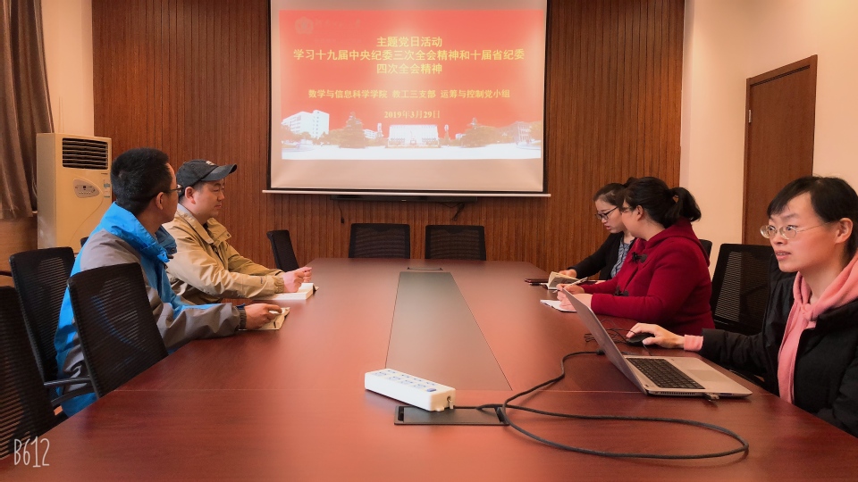 按照校纪委通知要求,教工三支部举行主题党日活动,学习十九届中央纪委三次全会精神和十届省纪委四次全会精神,具体包括习近平总书记在十九届中央纪委三次全会上的重要讲话、赵乐际在十九届中央纪委三次全会上所作的工作报告和十届省纪委四次全会有关要求和精神。活动在各个党小组开展,3月26日下午概率统计党小组在数学楼207进行,3月29日上午,运筹与控制党小组和计算数学党小组分别在数学楼107和数学楼103进行。