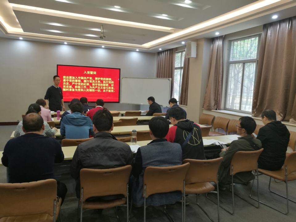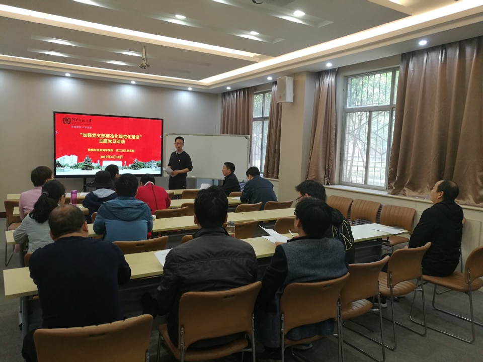 4月18日上午,教工三支部在数学楼103召开党员大会,开展“加强党支部标准化规范化建设”主题党日活动,2名党员(沈志萍,张瑞娜)请假,其他党员全部到会。会议由支部书记裴永刚主持。会议主要包括两项内容: