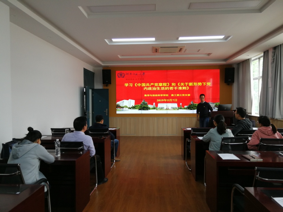 5月7日下午,教工三支部在数学北楼506召开党员大会,集体学习《中国共产党章程》和《关于新形势下党内政治生活的若干准则》。会议由支部书记裴永刚主持。