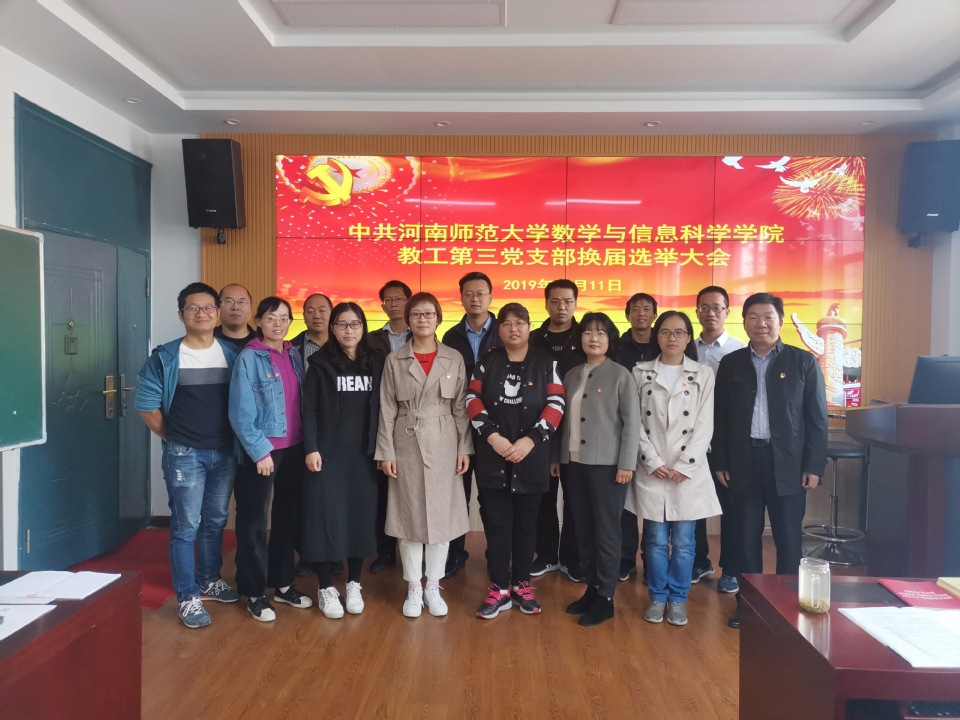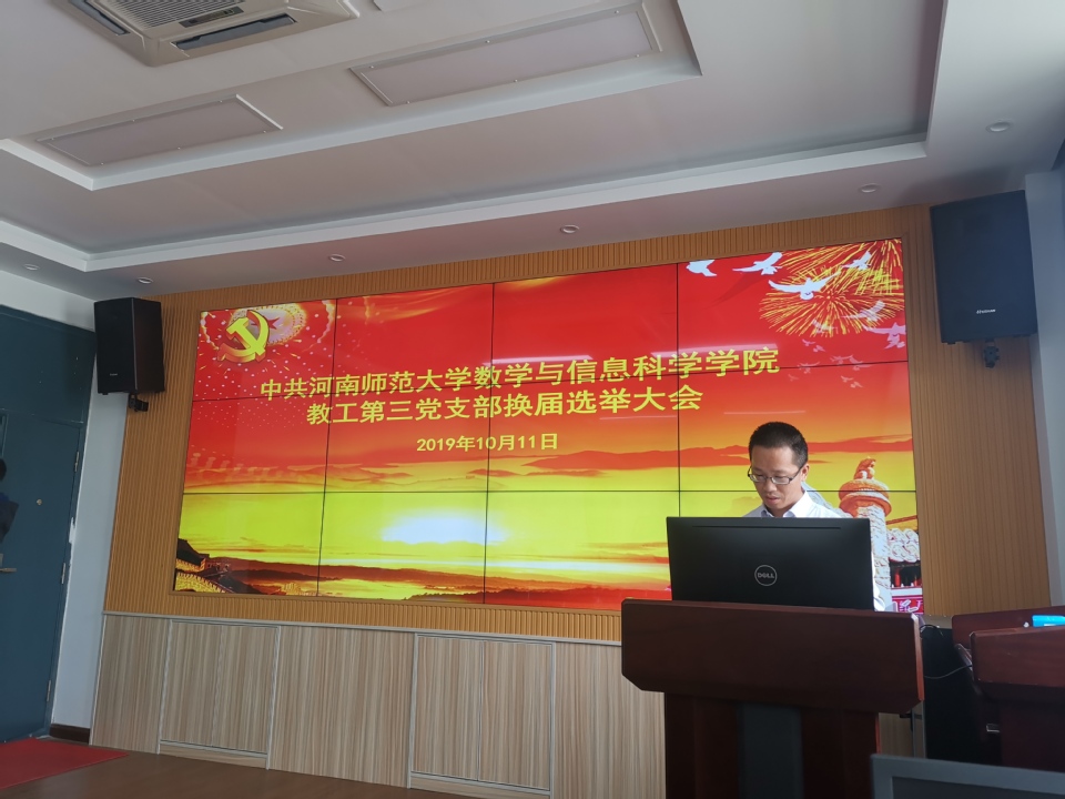 2019年10月11日上午,教工第三党支部在数学北楼506召开党员大会,选举新一届支委会。会议由裴永刚主持,共进行5个议程。第一项议程,裴永刚同志汇报本届委员会工作情况,并代表支部委员会述职。第二项议程,通过支部委员会委员候选人名单,第三项议程,通过大会选举办法。第四项议程,通过监票人名单和宣布计票人名单。第五项议程,选举数学与信息科学学院教工第三党支部委员会委员。通过大会选举,最终产生新一届支委:裴永刚,崔鲁宾,李超,并上报上级党委批准。