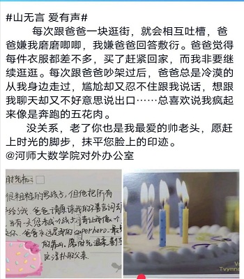 为弘扬中华民族传统孝道文化,激发同学们的感恩情怀。6月20日至21日,数学与信息科学学院开展“山无言,爱有声”父亲节活动,我院2018级与2019级学生积极参与其中。