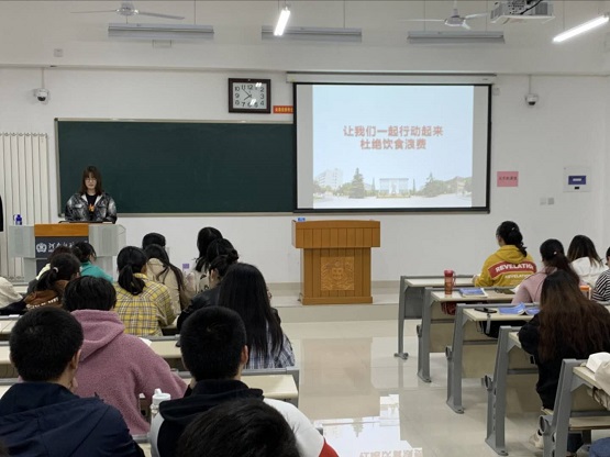本次活动利用课前十五分钟,以PPT宣讲的形式,就餐饮浪费现状讲解和杜绝饮食浪费倡议两个方面展开。在餐饮浪费现状讲解方面,结合习近平总书记对餐饮浪费问题的指示,通过展示不同图片来反映当前的餐饮浪费现象,劝诫同学们要珍惜粮食,以节约为荣,以浪费为耻。宣讲结束后,各班班委发起关于“杜绝饮食浪费”的倡议,号召同学们进行科学理性的绿色消费,自觉养成爱粮、惜粮、节粮的良好习惯。各班同学积极响应,并表示从现在开始要注重膳食均衡,合理搭配菜品,自觉弘扬勤俭节约的优良传统,将“光盘行动”践行到底。