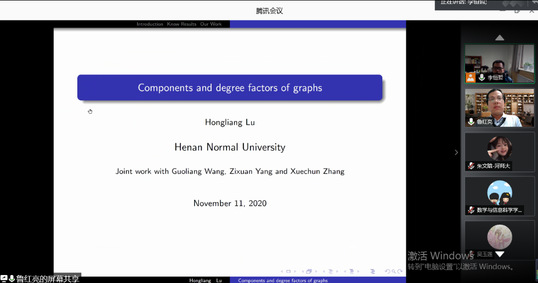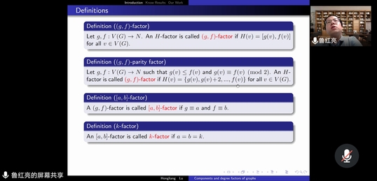 鲁红亮教授作了题为“Components and degree factors of graphs”的学术报告。报告介绍了k-因子,[a,b]-因子和(ab-因子的研究历史和刻画。然后,介绍他们团队推广Tutte 1-factor定理,给出图因子的Tutte类型刻画。最后,鲁教授介绍了关于强奇偶性的两个公开问题,以及他们团队在这两个公开问题的研究进展,相关问题研究难度大而且具有重要的理论意义。讲座结束后,鲁红亮教授就师生们提出的问题给予了详细的解答,报告内容丰富生动。