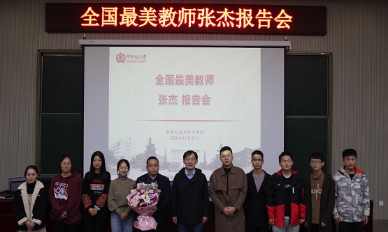 11月21日晚,数学与信息科学学院在数学楼报告厅举办全国最美教师报告会,我校2005级优秀校友、2020年“全国最美教师”张杰受邀担任主讲,学院相关负责人及教师代表、师范生代表近200人参与会议。