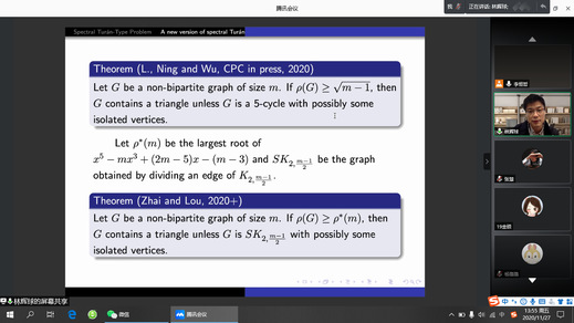 林辉球教授作了题为“Results and conjectures on the extremal spectral graph theory”的学术报告。报告从经典的Turan问题讲起,然后引入谱极值Turan问题。最后林教授介绍了他们团队近几年在该课题的研究成果以及相关公开问题,鼓励大家继续该课题的研究。讲座结束后,林辉球教授就师生们提出的问题给予了详细的解答,线上气氛十分热烈。