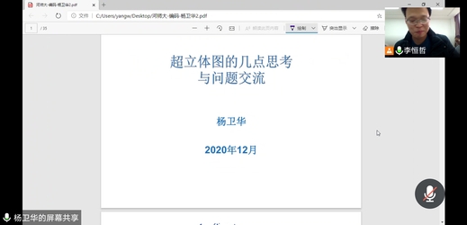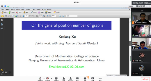 许克祥老师作了题为“On the general position number of graphs”的学术报告。详细介绍了一般位置集的定义,由此引出了一般位置数的概念。依次介绍了一些特殊图的一般位置数,例如仙人掌图,冠图,分离图等。其次分别刻画了树与一般图、圈与一般图和两棵树的卡氏积的一般位置数,并对于两棵树的卡氏积的一般位置数的证明过程作了详细的讲解。最后许克祥老师综述了相关理论研究进展,并列出了一些未解决的问题。