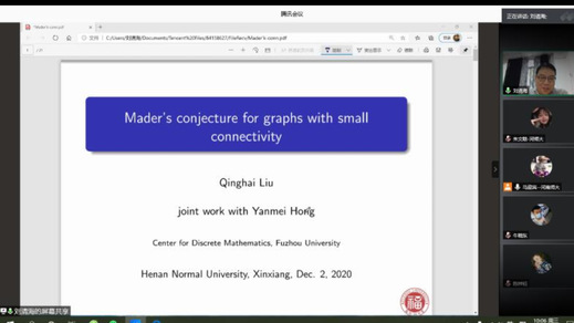 刘清海老师作了题为“Maders conjecture for graphs with small connectivity” 的学术报告。首先,刘清海老师在报告中简单介绍了Maders conjecture 的内容,让同学们对其有了深刻的了解,然后对目前已有的结果作了详细的介绍。在此基础上,刘清海老师给出了一个嵌入的刻画,并利用这个刻画证明了连通度为23时猜想成立。