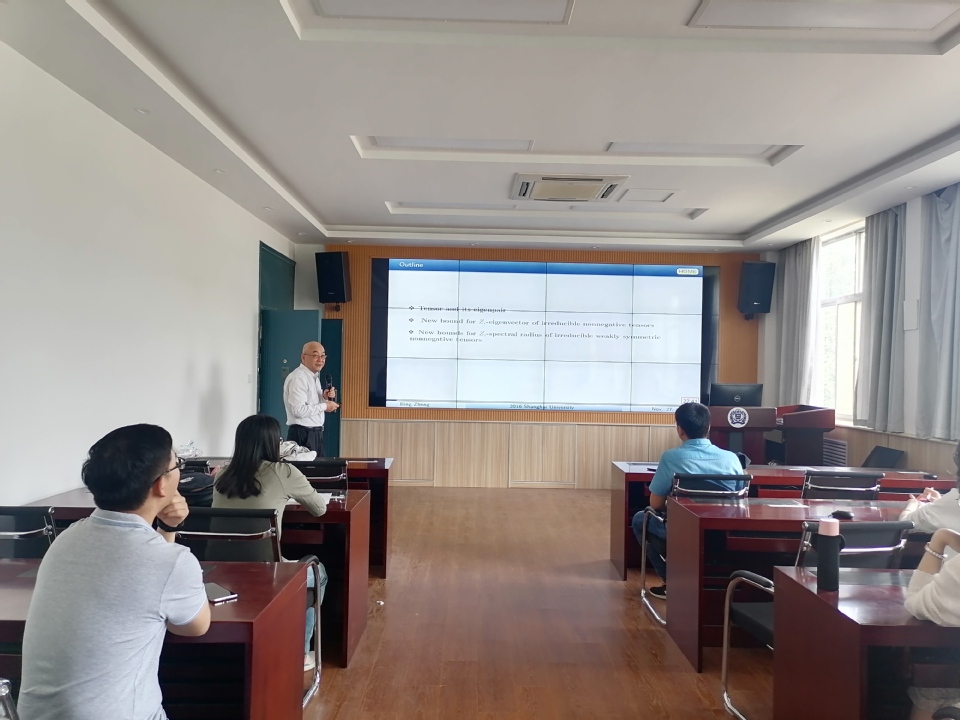 515日,应数学与信息科学学院的邀请,兰州大学郑兵教授在我校数学北楼506大数据实验室为我院师生作了“The bounds for Z-eigenpair of irreducible Nonnegative tensors”的学术报告,相关专业教师、研究生、本科生等共三十余人参加了会议。