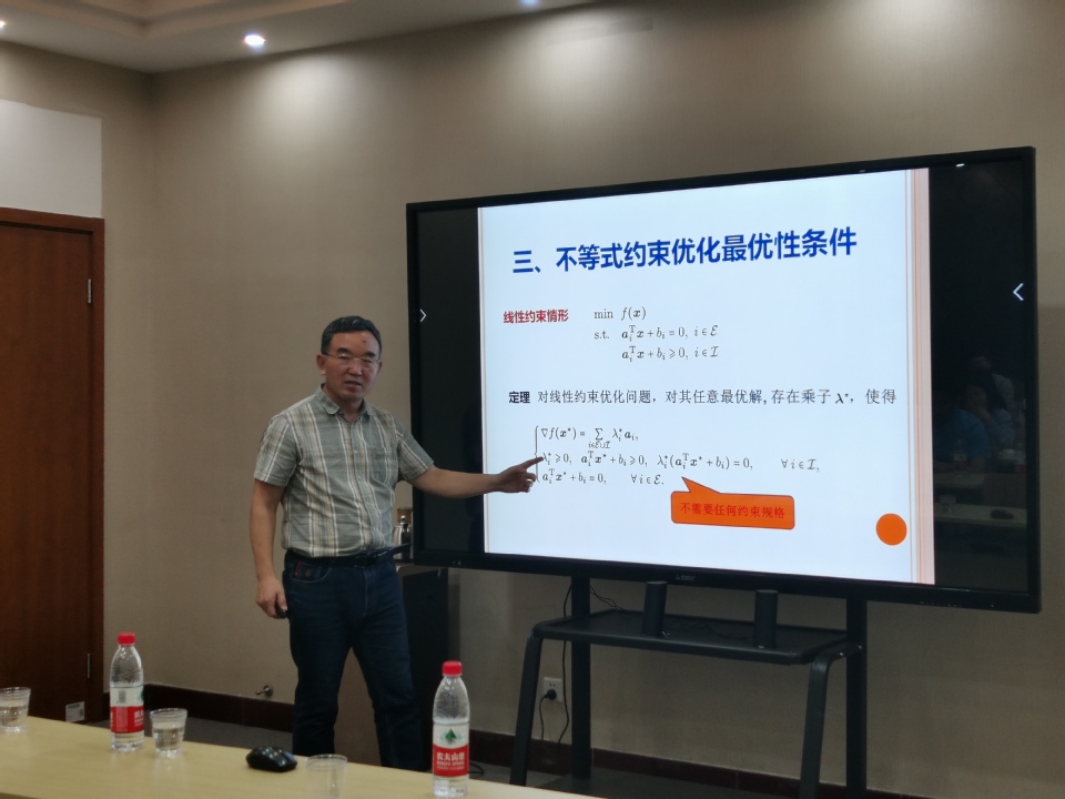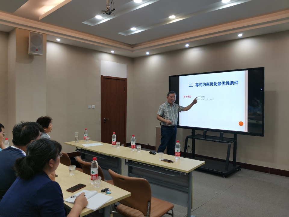 王宜举教授先系统阐述约束优化问题的最优性条件。然后借助等式约束优化凸优化问题的最优性条件引出Lagrange函数的鞍点理论,再据此引出约束优化问题的对偶理论,并给出了约束优化问题的强弱对偶定理。最后通过具体例子给出对偶的理论意义和应用价值。王宜举教授的报告高屋建瓴,深入浅出,听报告师生与王宜举教授热烈讨论,受益匪浅。