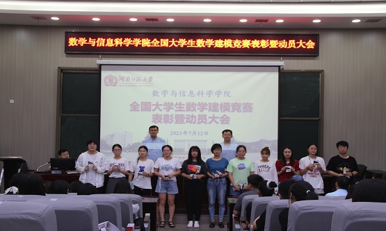 2021年7月12日上午,数学与信息科学学院在学院多功能报告厅召开了全国大学生数学建模竞赛表彰暨动员大会,学院党委副书记吴耀武,副院长董乐出席此次大会,数学建模指导老师,2018、2019级辅导员,2020年获奖学生代表及2021年备赛学生全体参加此次大会。