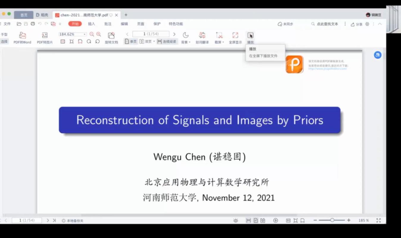 谌稳固研究员作了题为:“Reconstruction of Signals and Images by Prior Information”的学术报告。在本次讲座中,谌稳固研究员讨论了考虑通过不完全观测的先验信息来重建信号和图像的问题,其中先验信息包括稀疏性、低秩性、深度图像先验支集信息。他的报告语言凝练,深入浅出,观点新颖,启发性强,为同学们今后的科研工作和未来发展提供了深刻的借鉴意义。