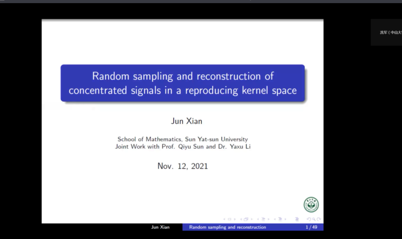 冼军教授作了题为:” Random Sampilng and Reconstruction of Concentrated Signals in a Reproducing Kernel Space” 的报告。在本次报告中考虑对集中在计量空间的有界Corkscrew域上的信号进行(随机)抽样,并从Corkscrew域中所包含的抽样集上的(未)损坏的抽样数据中近似地重建集中的信号。研究成果再现核空间的集中信号集上为(随机)抽样方案建立了双利普希茨类型的加权稳定性。