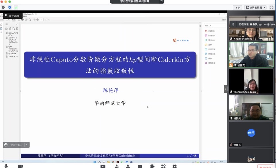 应数学与信息科学学院邀请,华南师范大学陈艳萍教授于418日下午在腾讯会议平台上作了题目为《Exponential convergence of hp-discontinuous Galerkin method for nonlinear Caputo fractional differential equations》的专题学术讲座。学院相关研究方向的青年教师和研究生70余人参加了此次会议。